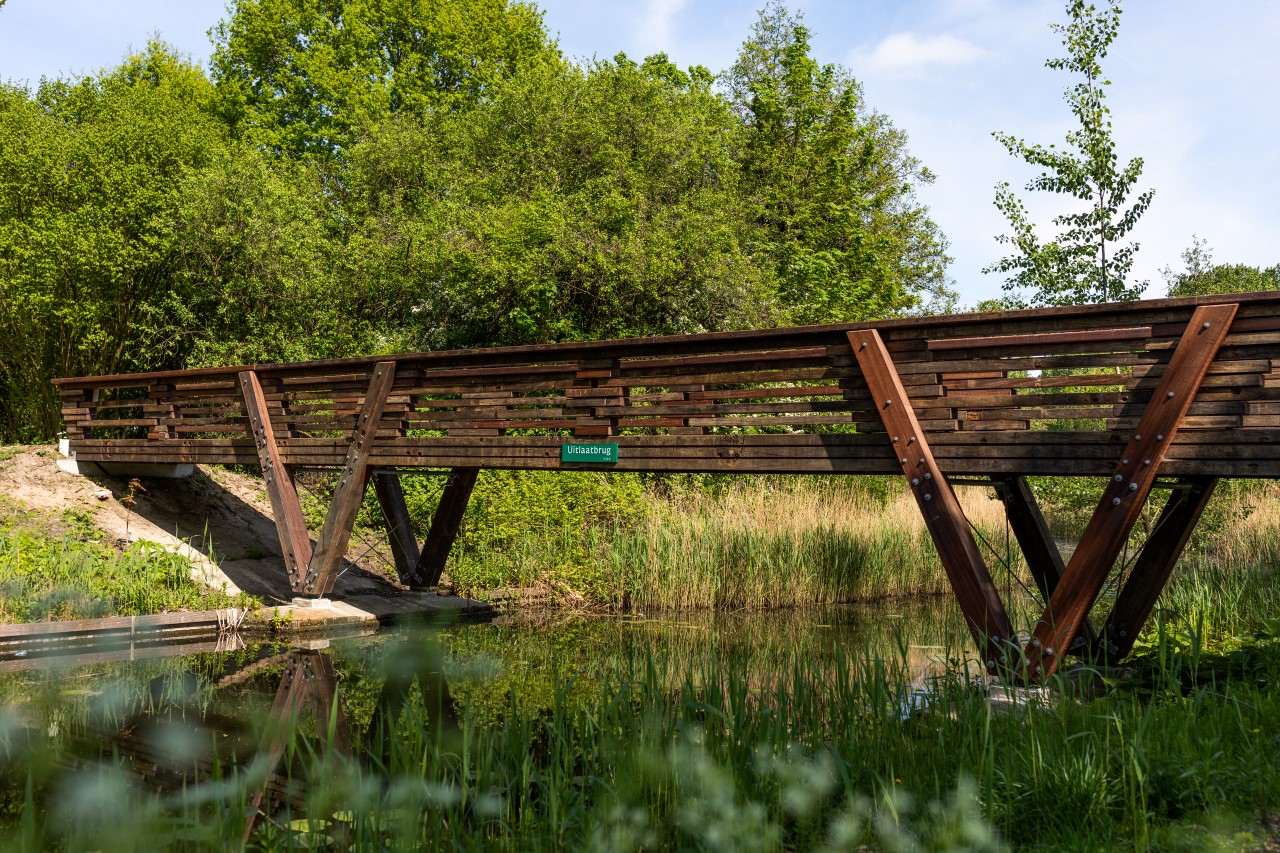 Omschrijving: In Almere-Haven zijn onderdelen van een oude brug circulair verwerkt in een nieuwe voetbrug. De voetbrug vormt de nieuwe oversteek naar het ‘Boomfeestbos’ in woonwijk De Werven in Almere-Haven. De Werven is één van de wijken van Almere-Haven welke gekenmerkt wordt door brede vaarten omzoomd door veel groen. De openbare ruimte in de wijk is recentelijk geheel gerenoveerd. De voetbrug vervangt een vervallen houten wandelbrug op deze plek. De nog goede onderdelen van de oude brug zijn circulair verwerkt in het nieuwe kunstwerk. De houten leuning met horizontale lamellen vormt een blokligger van oever tot oever dat halverwege wordt ondersteund door karakteristieke samengestelde v-vormige tussensteunpunten.